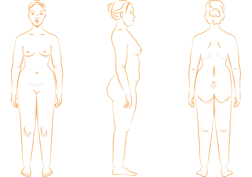 Lipedema can be recognised by an increase in subcutaneous fat tissue, which is usually first distributed on the extremities (legs and arms) and, as the disease progresses, eventually affects the hips and buttocks (in the form of so-called saddlebags) and other areas. The distribution of fat on the legs and arms can vary greatly from person to person. Some patients suffer more from fat increase in the area of the upper or lower legs (or upper or lower arms); in other patients, the entire leg or arm may be affected. However, this fat distribution disorder always occurs symmetrically. Painful fat distribution disorders or increases in volume, even if they have not yet been empirically proven to be lipedema, can affect various parts of the body: