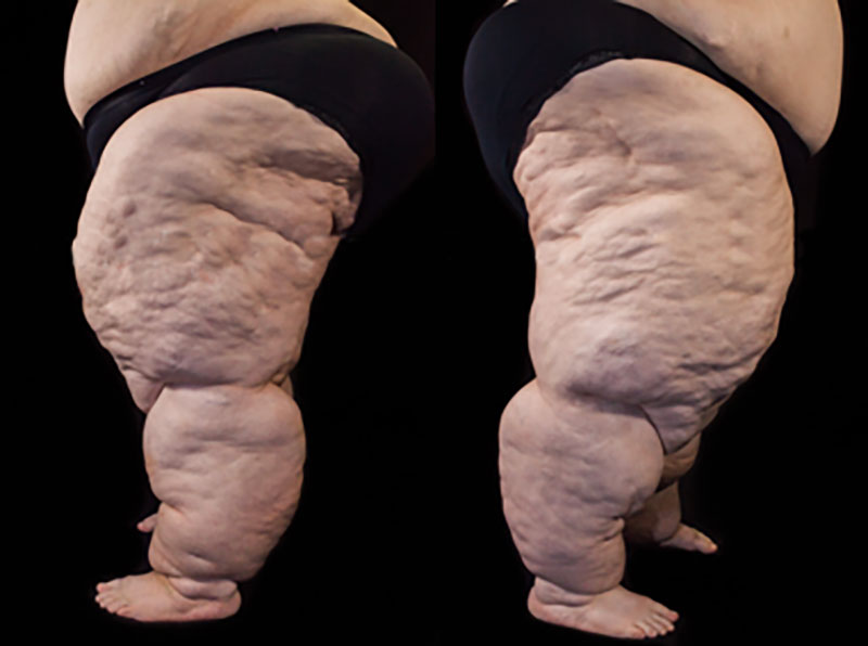 Large fat pads form, fibrosis tissue, which is perceived as ‘painful noodles’ under the skin. The saddlebags become more pronounced and the knees and ankles are clearly thickened.